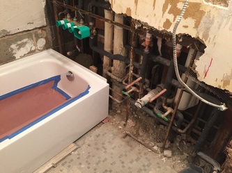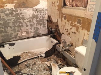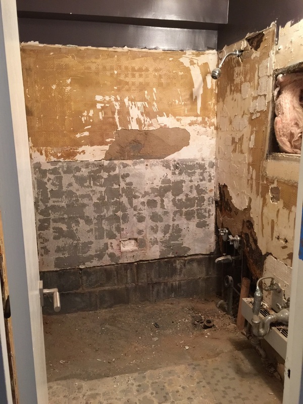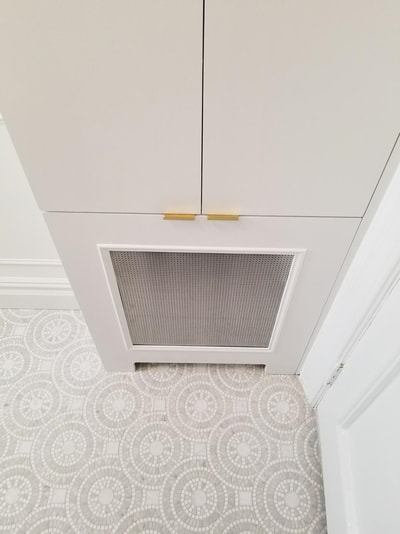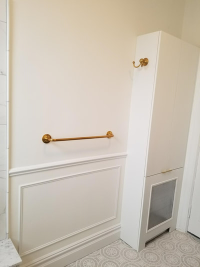Manhattan, Bathroom - Before / After. Marble mosaic floor, golden accessories, covered radiator with a storage above.